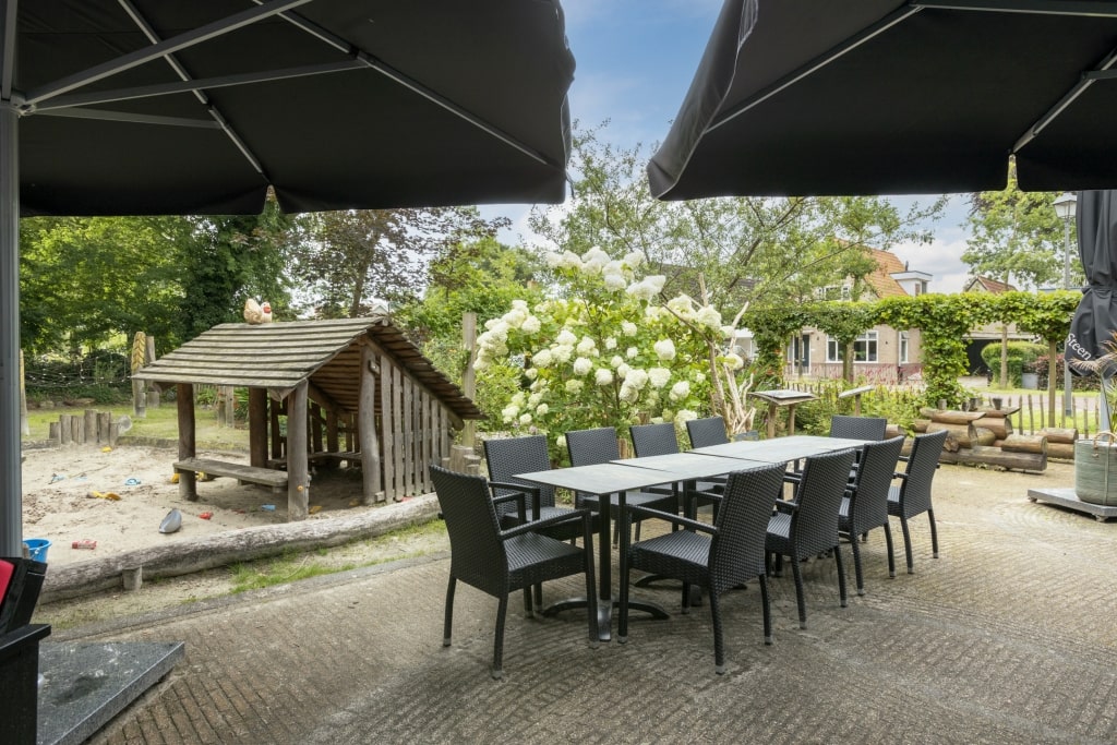 Centraal in de buitenruimte ligt een groot terras, sfeervol ingericht met comfortabel tuinmeubilair en grote parasols. Hier drink je ’s ochtends je koffie in de zon, lunch je samen aan lange tafels of geniet je van een goed glas wijn terwijl de kinderen spelen.